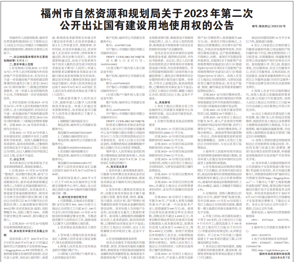 8月7日,福州市自然资源和规划局发布《福州市自然资源和规划局关于2023年第二次公开出让国有建设用地使用权的公告》,将于9月1日上午9时30分在福州市公共资源交易服务中心公开出让市城区十四幅国有建设用地使用权。
