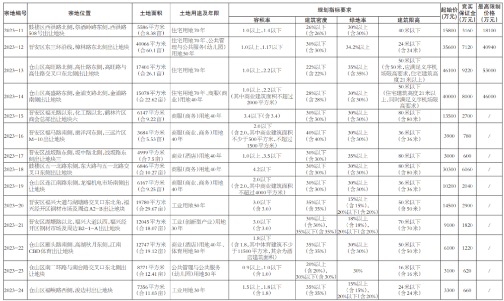 14宗地块总出让面积16.62万㎡,总起价23.45亿元,涉及鼓楼区2幅,晋安区6宗,仓山区6宗。其中,住宅地块4宗(宗地2023-11号至14号),共78131㎡,起拍价13.75亿,分别位于鼓楼区、晋安区和仓山区(2宗);非住宅地块10宗(宗地2023-15号至24号)。