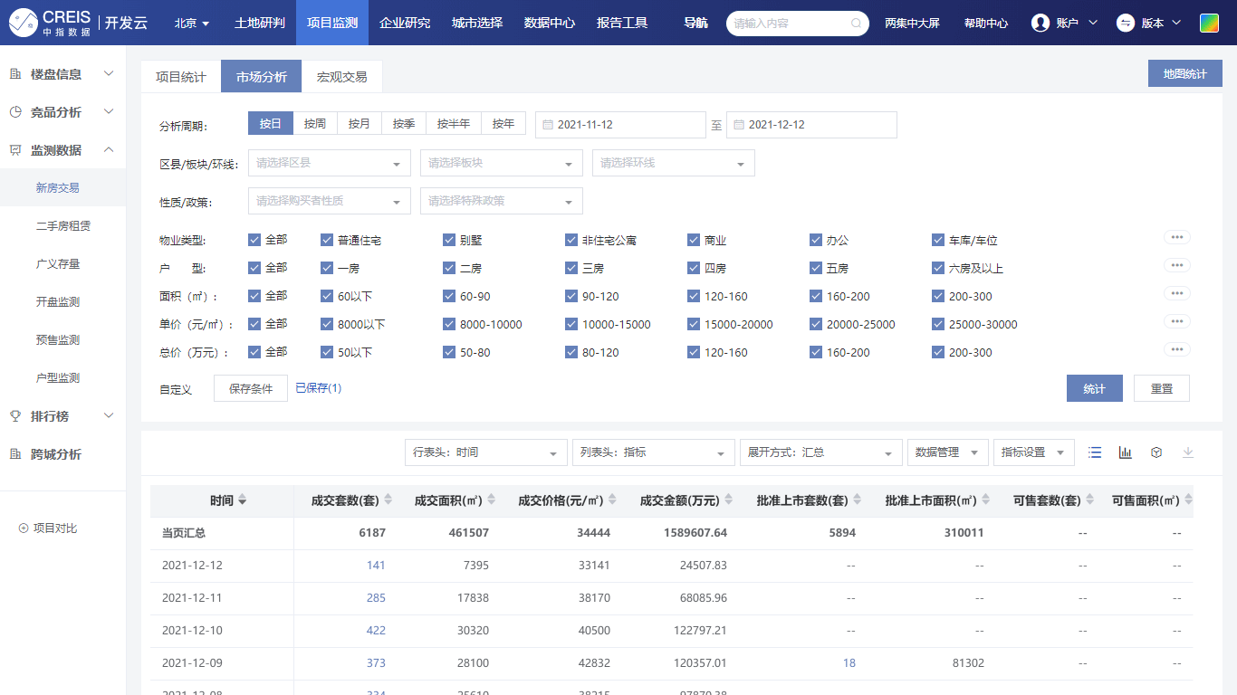 全量查询城市项目信息,支持单套房产交易状态查看;交易数据可按户型、面积、价格等维度快捷交叉分析;项目周边竞品项目、全市潜在竞品项目数据快速对比;实现跨城市项目、土地数据的一张表统计分析与下载。