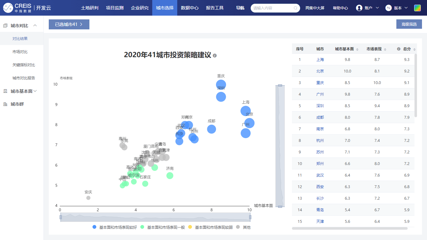 开发云基于人口潜力、经济发展水平、资源禀赋、市场表现的4个层面19个指标展开分析,基于中指自研评价模型对目标城市给出定量得分,为用户提出综合城市布局投资策略建议